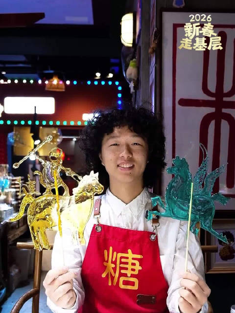年味渐浓,郑州街头“00后”糖画师王岐洋走红。一勺糖稀流转间,勾勒出1.86米高糖画孙悟空、金龙、天安门等佳作,迄今已画20多万幅。