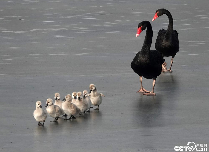 “三九”时节,北京圆明园曲苑凤荷景区,黑天鹅妈妈们带领八只幼崽在冰上行走、栖息,毛绒绒的鹅宝们姿态各异,活泼有趣,萌态十足,吸引许多游人观看拍照。