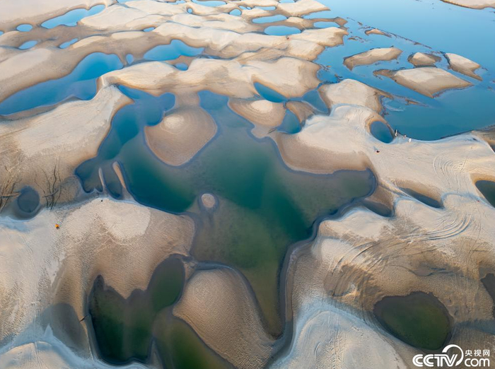 受长江水位下降影响,汉口江滩至天兴洲间裸露出绵延数公里的沙坑群。沙坑蓄积江水,在阳光下折射出蓝绿色波纹,宛如“翡翠”镶嵌于金色沙滩,形成冬日限定自然景观。