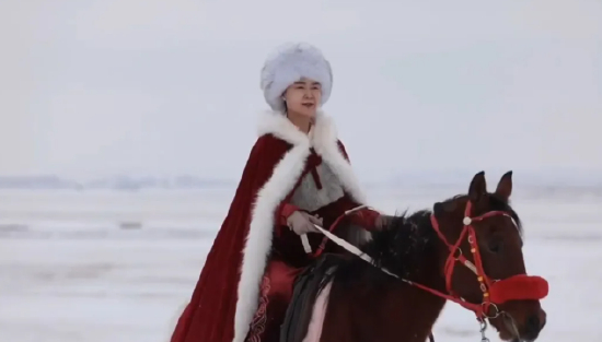 当时昭苏已经下雪了,天马旅游文化园还是会不定时举办小型的“万马奔腾”活动:上百匹骏马被同时放出,在白雪皑皑的草原上疾驰,极为壮观。贺娇龙穿上了原本给网络红人准备的、作为道具的红色汉服,披着一件有白色毛领的红色披风,戴着毛茸茸的白圆帽,在雪地上骑马驱驰着更多马儿往远方跑去。